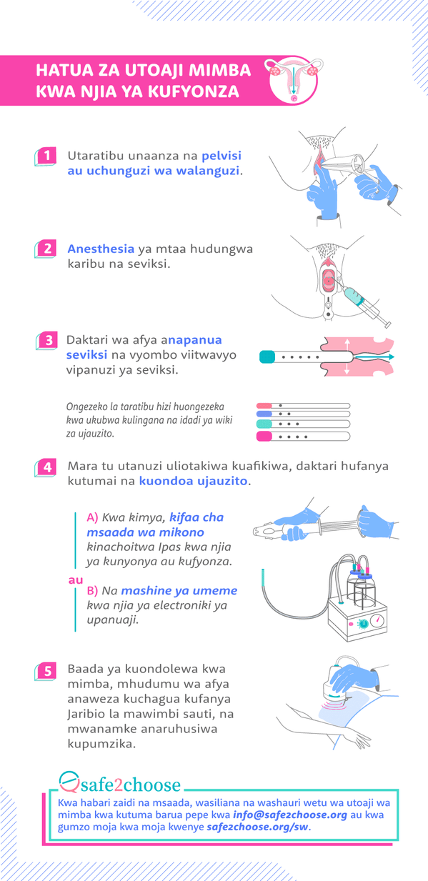 Utoaji mimba kwa kutumia Njia ya kunyonya au kufyanza au Upanuaji na ukwanguaji kwa njia ya electoniki ni aina za utoaji mimba wa kliniki ambazo zinaweza kufanyika kwa mimba zenye hadi wiki 14 za ujauzito (kwa Njia ya Kunyonya ua Kufyonza) na hadi wiki 16 (kwa Upanuaji na ukwanguaji kwa njia ya electoniki ). Unaweza kupata taarifa zote unazohitaji kwenye ukurasa huu. Ikiwa bado una maswali, wasiliana na timu yetu ya ushauri.